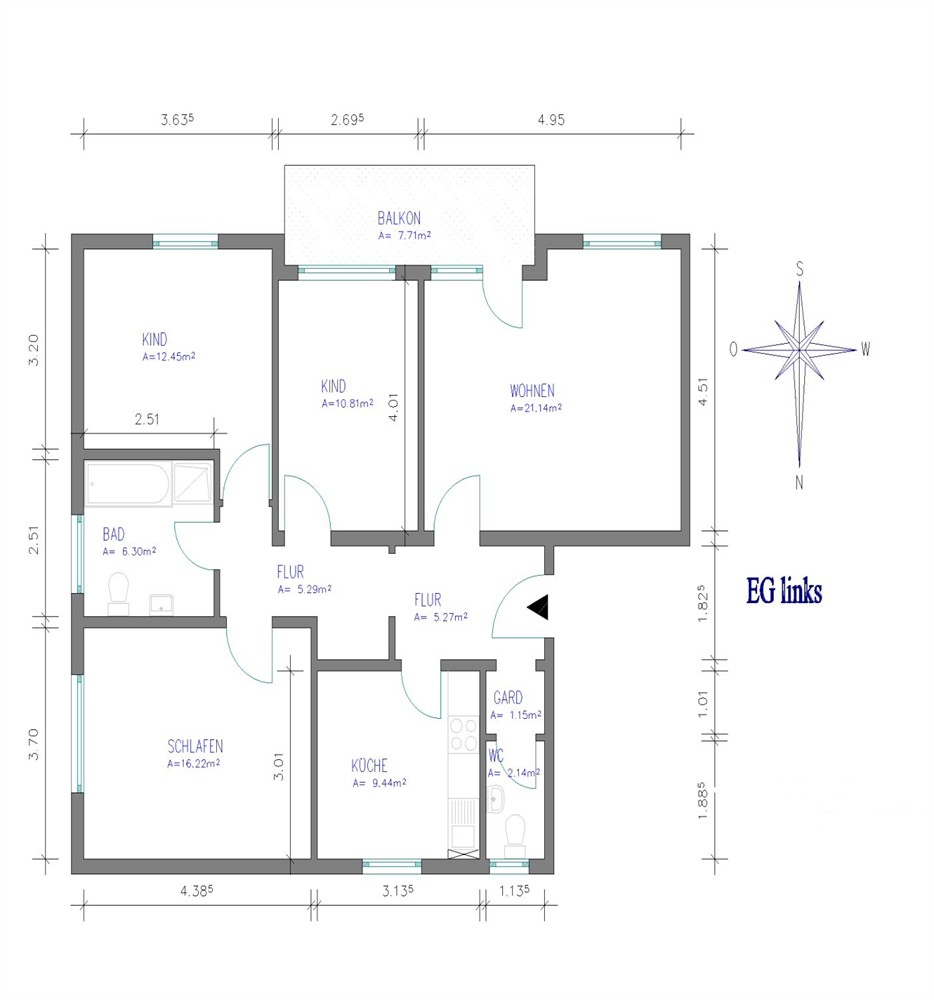 Über den zentralen Flur gelangen Sie in alle Räume. Den Süd-Balkon erreichen Sie über das Wohnzimmer. Des Weiteren ist die Wohnung mit einem Tageslichtbad mit Dusche, Wanne, Waschbecken und WC ausgestattet. Ein Gäste-WC steht Ihnen ebenfalls zur Verfügung.