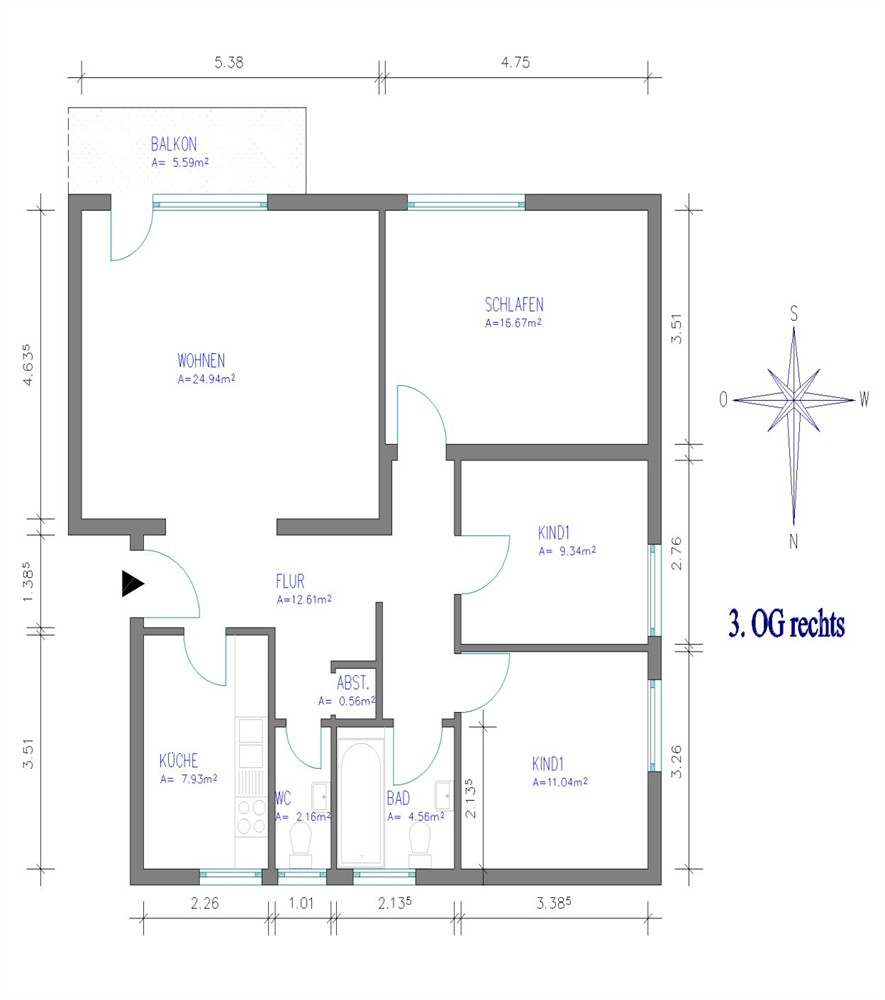 Diese Wohnung verfügt über einen Balkon, der sich an der Südseite des Gebäudes befindet und vom Wohnzimmer aus zu betreten ist.