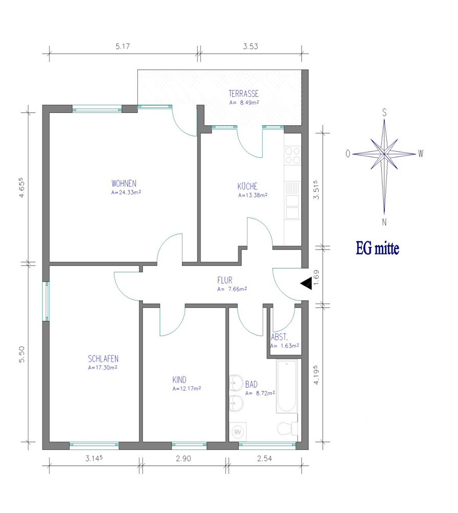 Auf die Terrasse gelangen Sie über die Küche oder über das Wohnzimmer.Im Flur steht Ihnen ein kleiner Abstellraum zur Verfügung.