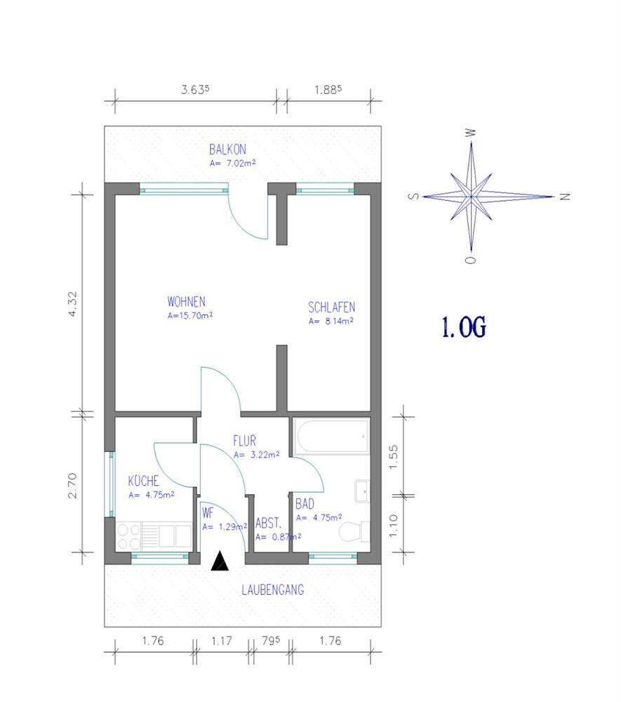 Über den Laubengang kann die Wohnung erreicht werden. Vom Eingangsbereich aus können die Küche, das Badezimmer und das Wohnzimmer betreten werden. Im Flur, neben dem Badezimmer ist eine kleine Abstellkammer, die Ihnen die Möglichkeit bietet Vorräte oder andere Gegenstände zu verstauen. An das Schlafzimmer grenzt das Wohnzimmer an von dem der Balkon betreten werden kann. Vor dem Grundstück sind öffentliche Parkplätze vorhanden.